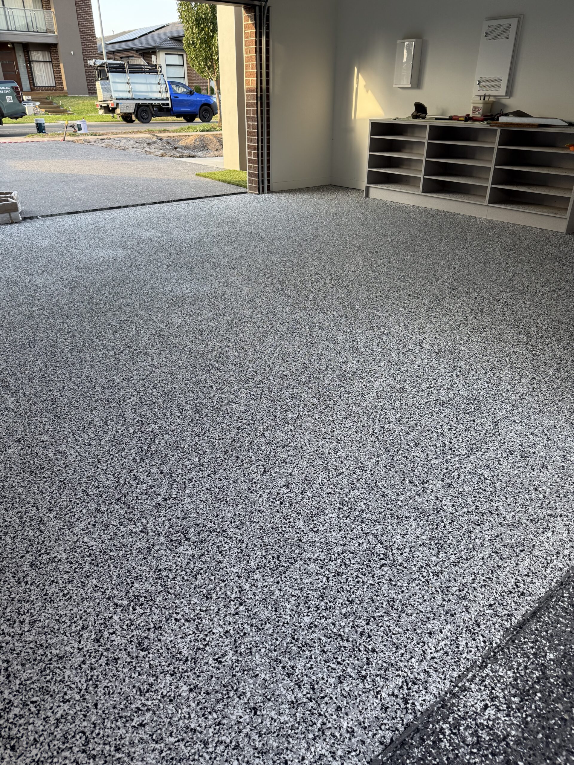 This Berwick garage was completed with an Epoxy Essential Finish featuring a Pipeline Grey base with Cookies & Cream Ultra Flake. The result is a clean, modern, and durable garage floor that instantly refreshed the space.