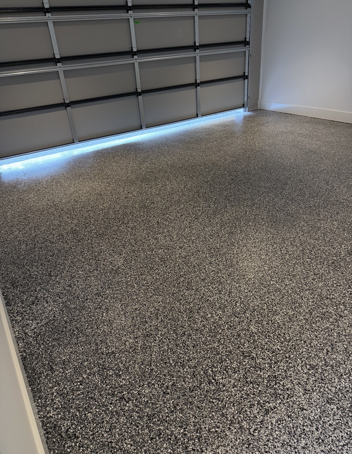 Once the surface was properly prepared, we applied an epoxy flooring system featuring a Dark Grey base with Cookies & Cream Ultra Flake – Essential Finish.