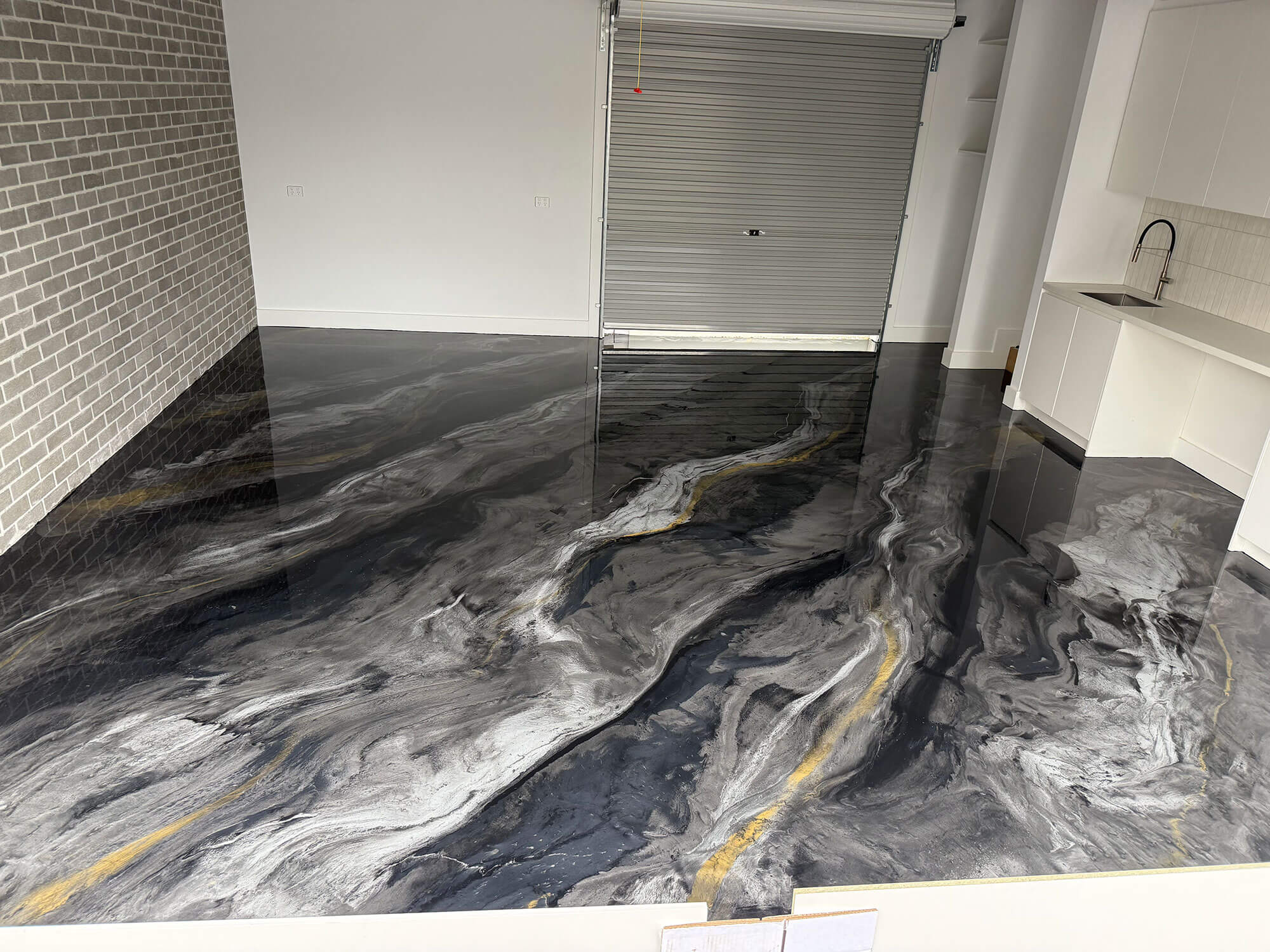 We recently completed this stunning Metallic Marble Epoxy garage floor in Croydon, Victoria. Featuring a tinted black epoxy glaze infused with silver and white metallic tints, we elevated the look with a touch of gold flakes for a sleek, custom finish. This high-gloss, seamless coating doesn’t just look incredible – it’s also durable, easy to clean, and built to last.
