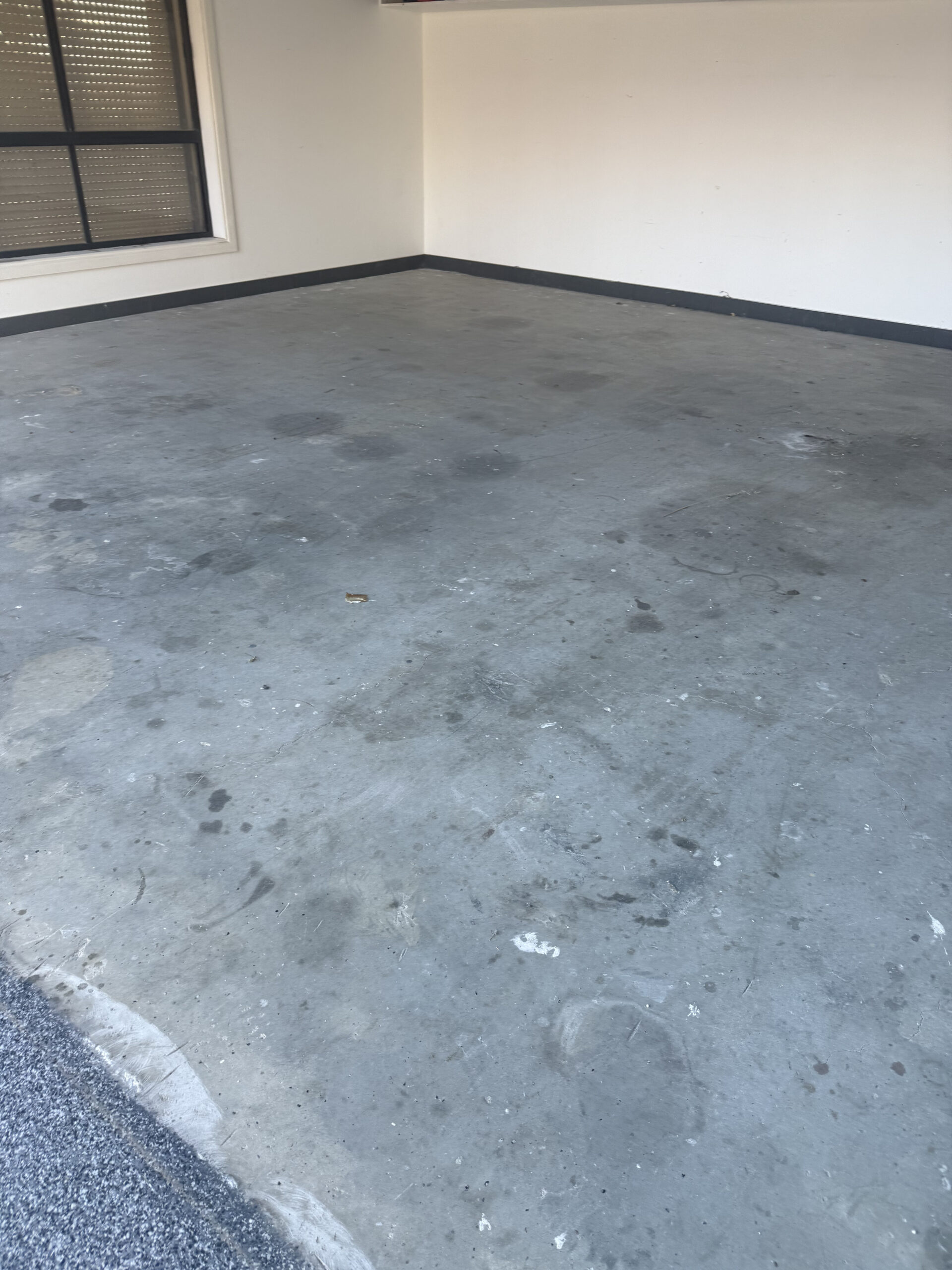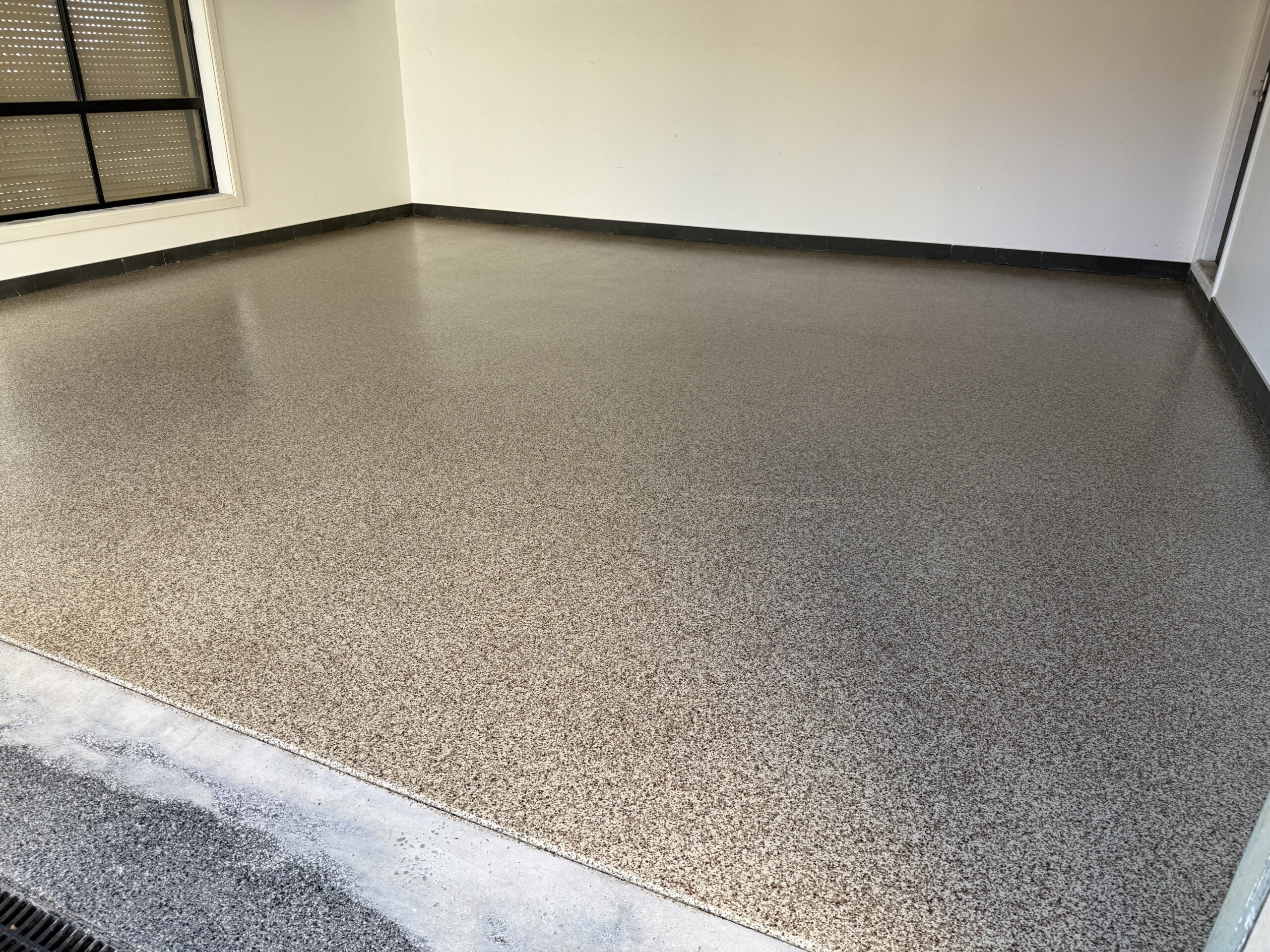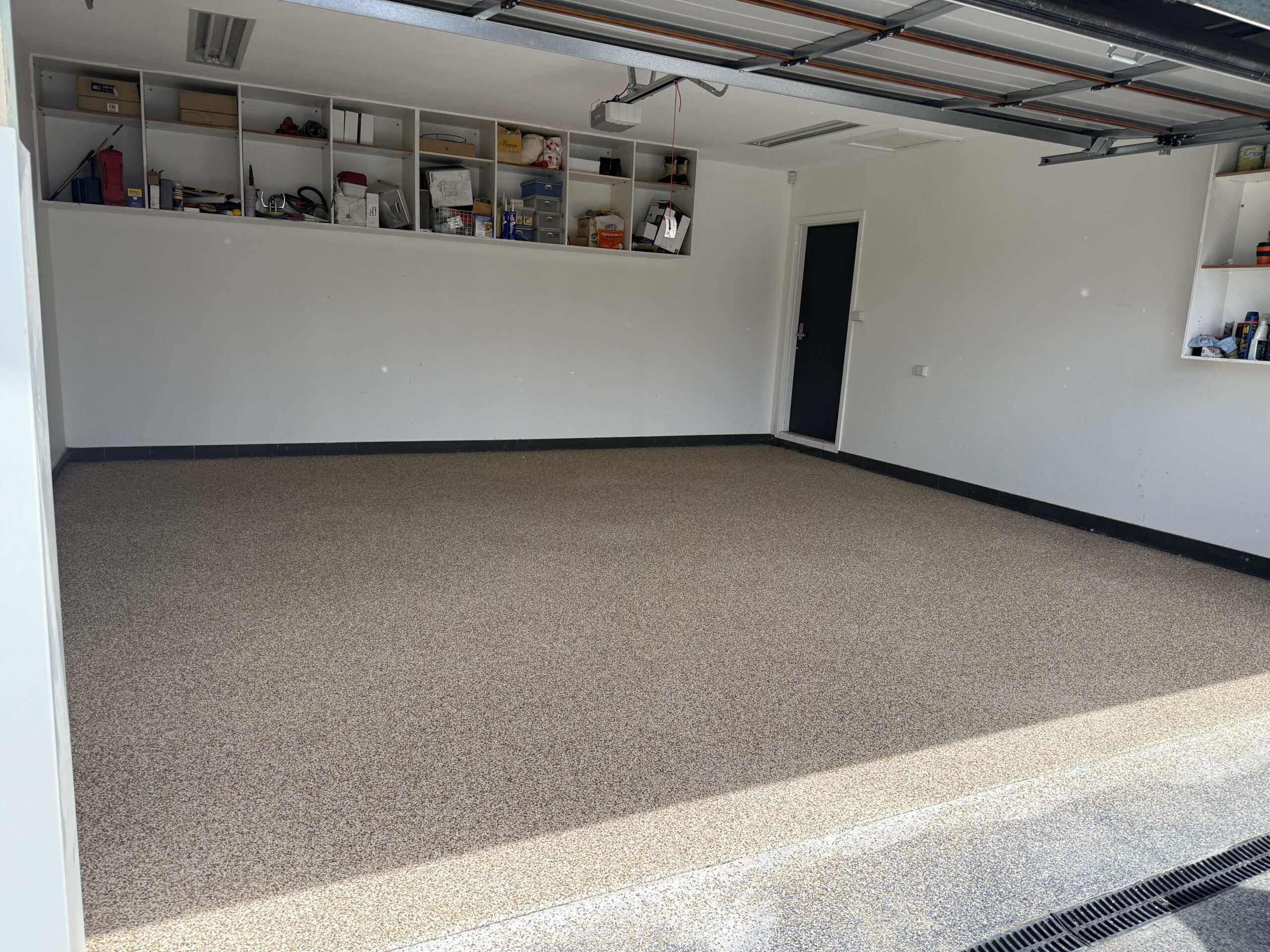 This Hallam garage was finished with an Epoxy Essential Finish using a Marino base with Almond Ultra Flake. The neutral tones delivered a clean, modern look while providing a durable and easy-to-maintain surface.